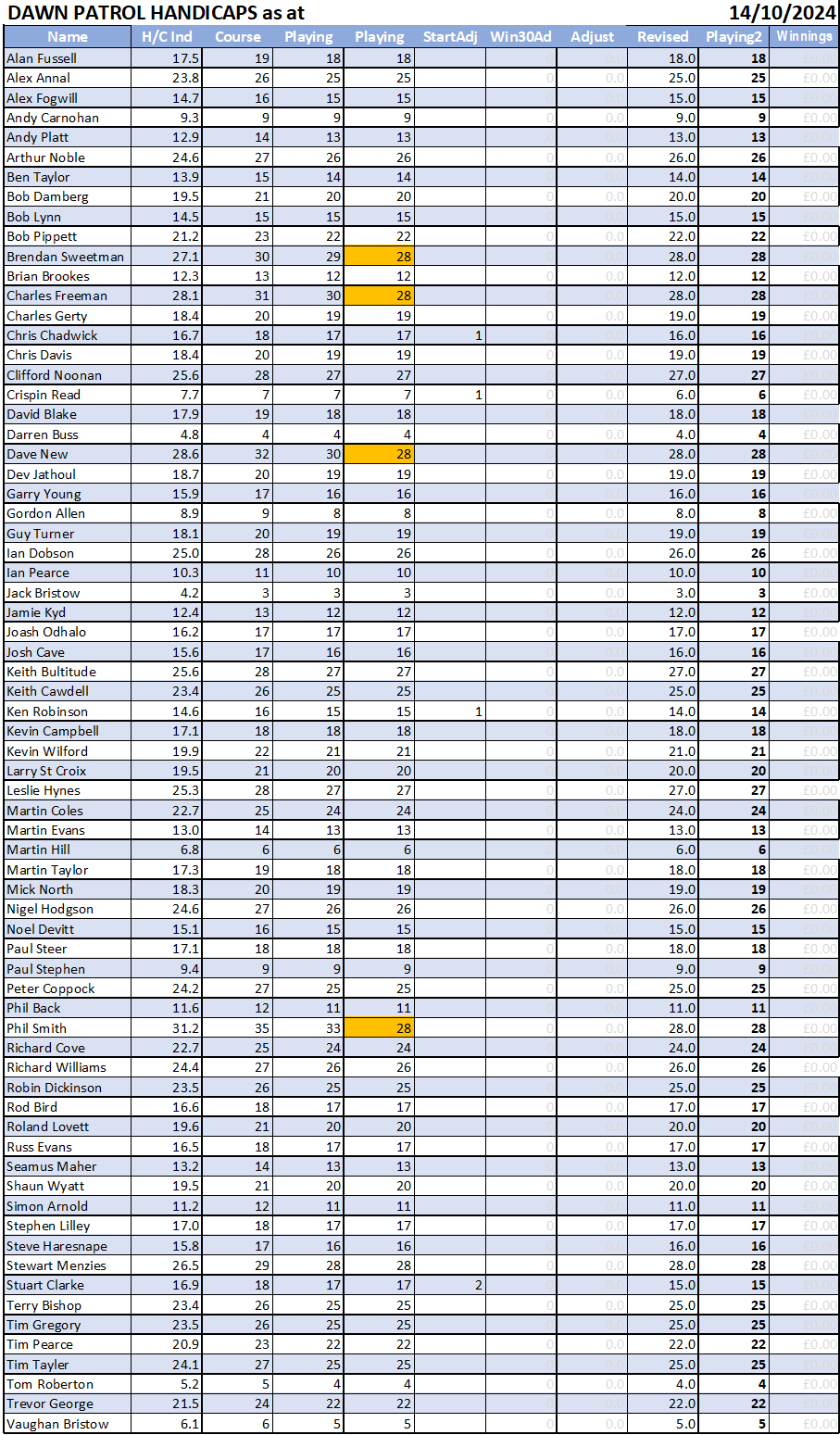 Your Dawn Patrol Handicap will now be ‘dynamically’ linked to the WHS Handicap Index throughout the playing season. We will use the yellow tee WHS slope charts as published by the main club. So as an example, we reset our shots lost and money counters on the 1st of October but continue to play off the Yellow Summer Tees if that is what the club is doing. When the club change to yellow winter tees, the tracking system will make the change, and you may notice your DP handicap change as a result.