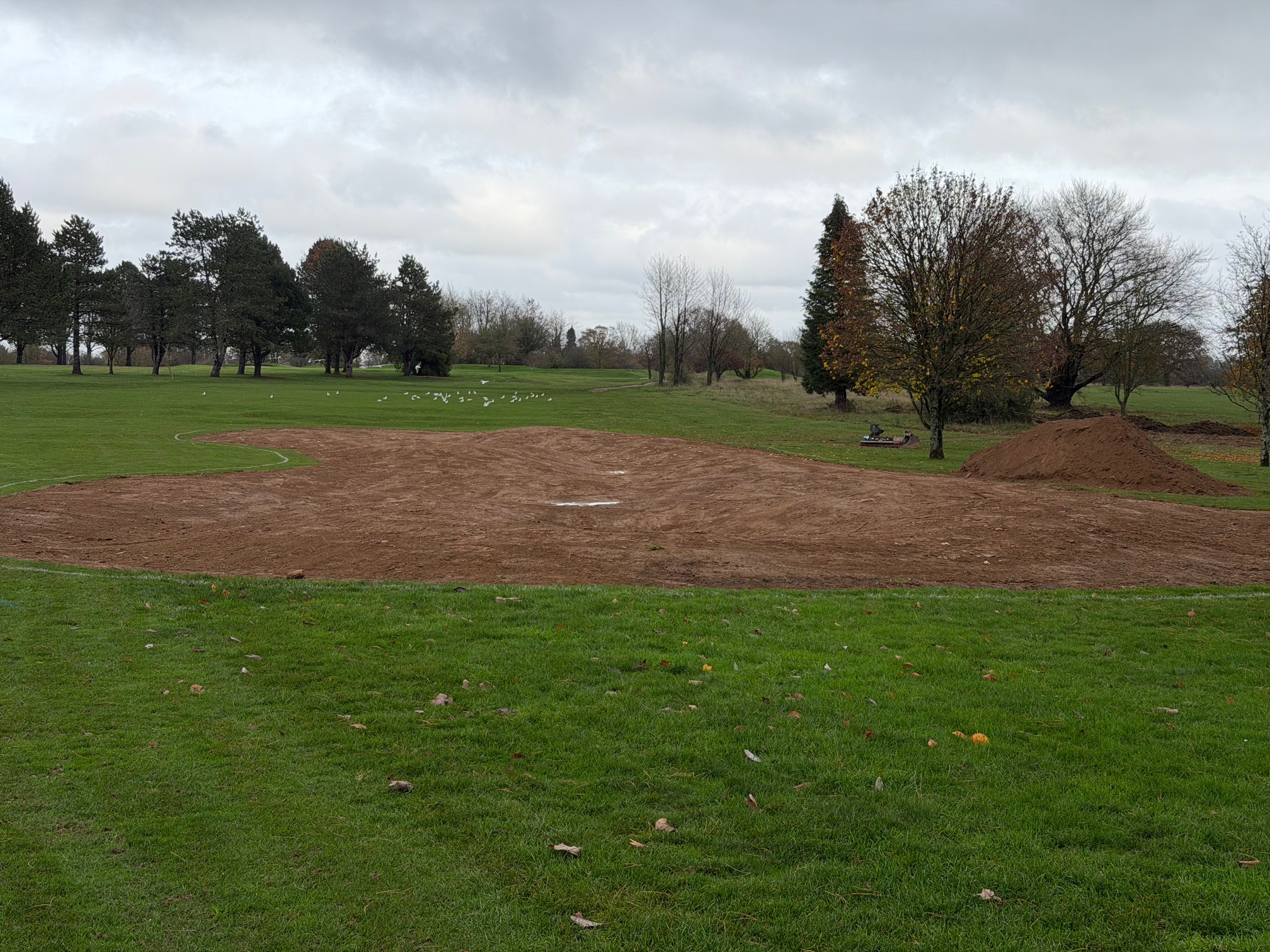Work on the 6th hole continues at a steady pace. In the mid-fairway area, the team is grassing and contouring the bunkers on the left and constructing a new bunker on the right. Around the green, work includes grassing and contouring the right-hand bunker and enhancing the one on the left.
